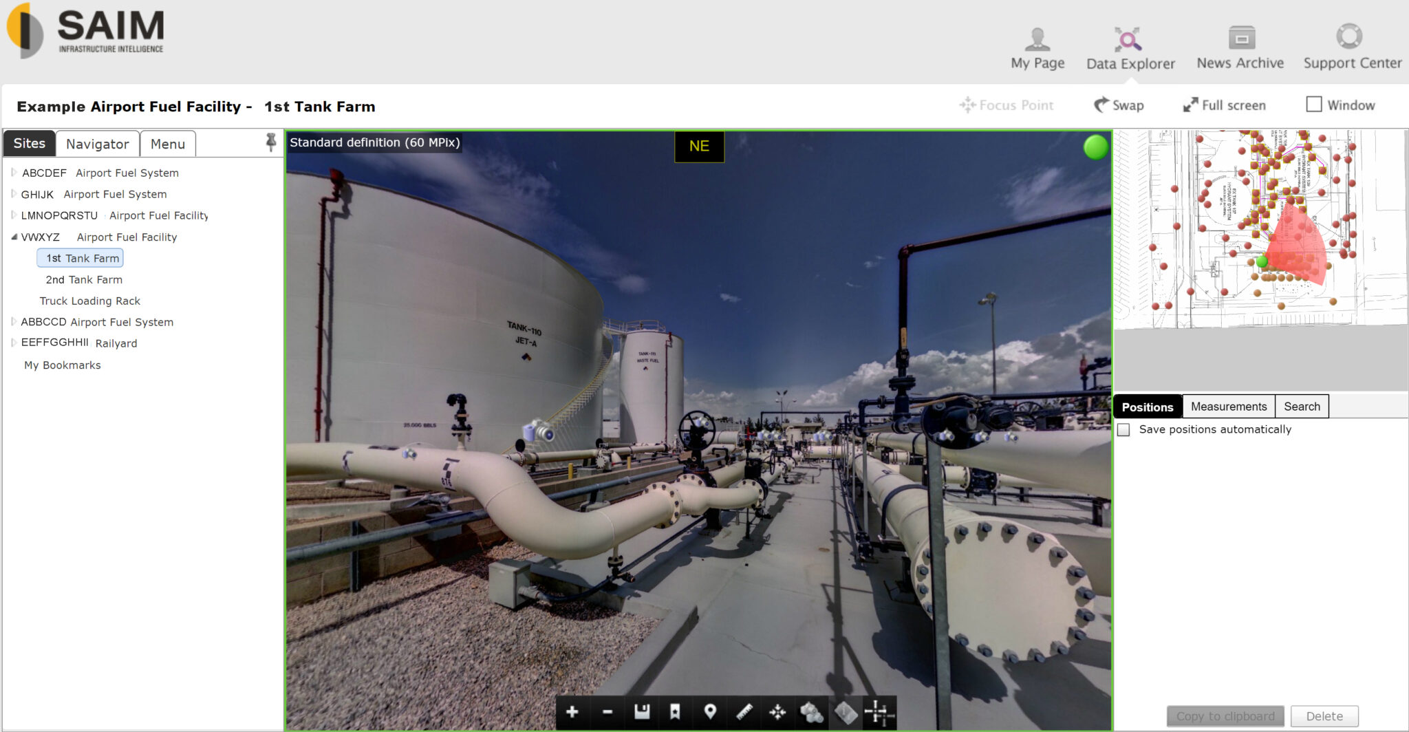 Next, using a network of surveyed targets, the LiDAR scan positions are combined into one unified point cloud; a process called registration. The registered point cloud can be exported to a variety of software programs for the engineering team’s design and analysis. The colorized panoramic photos, taken simultaneously at each scan position, are then stitched over the gray-scale point cloud data sets for an enhanced visualization. The cloud-based SAIM platform offers 24/7 access to the LiDAR scan and panoramic photos without needing installation of specialized software, having specific skills or powerful computers to run the point cloud. You can virtually navigate the model and visually verify items from anywhere in the world.